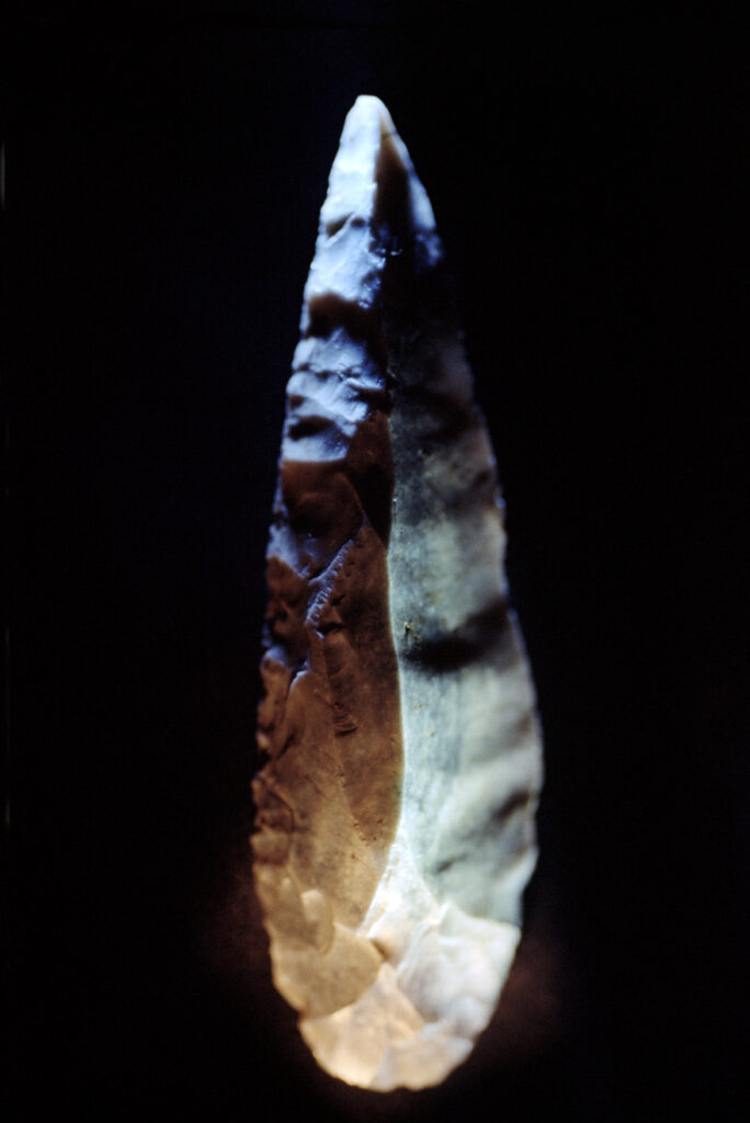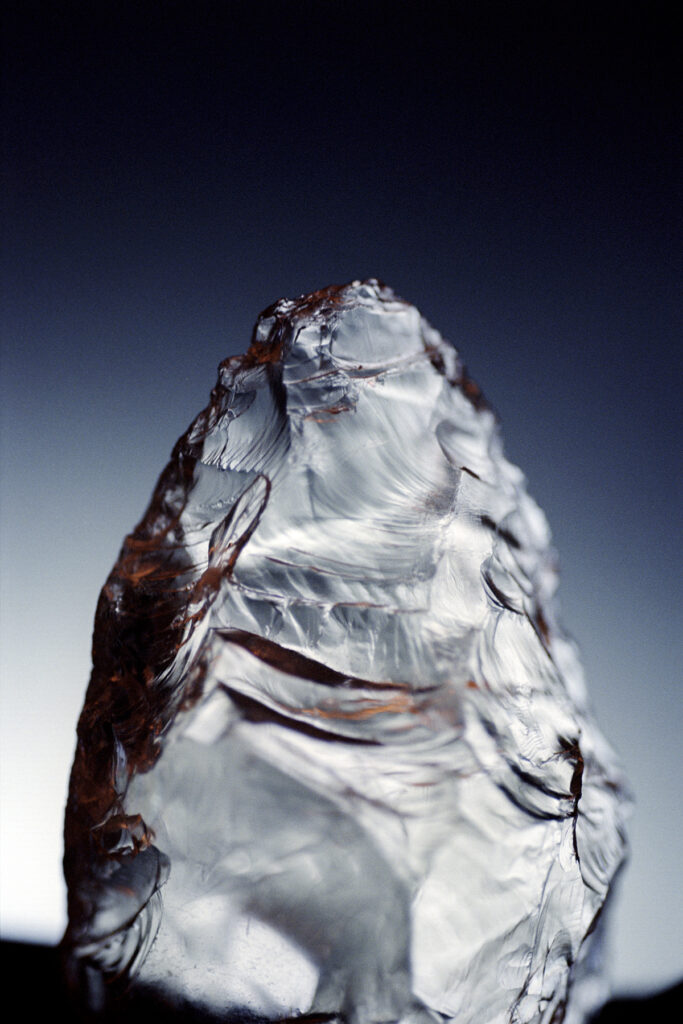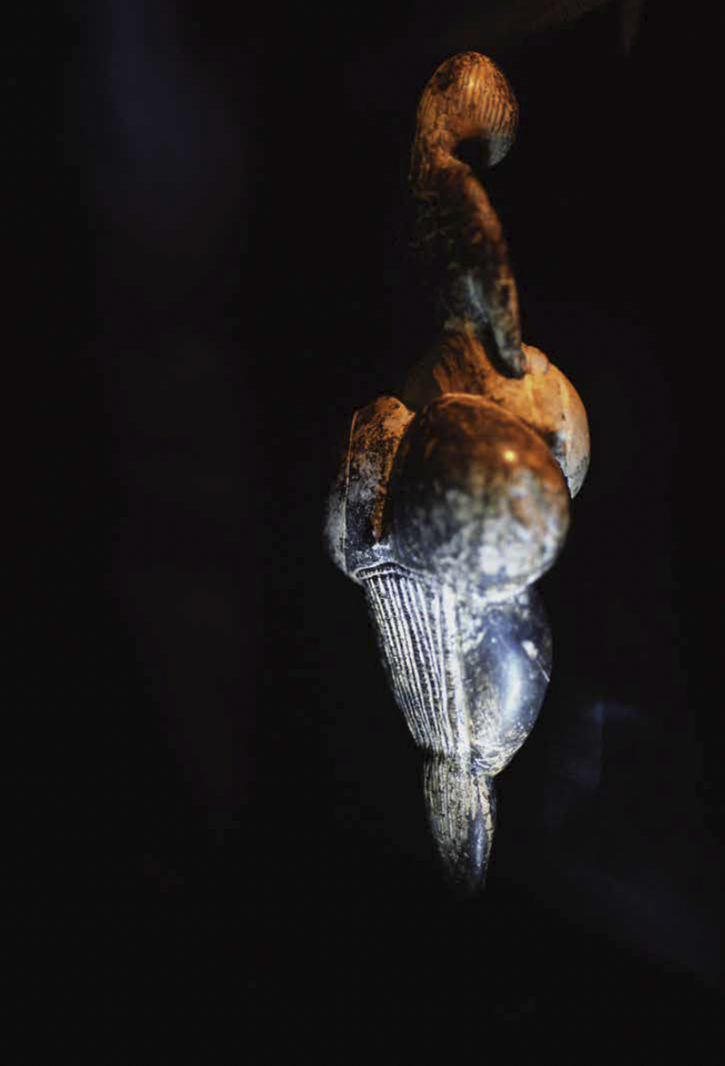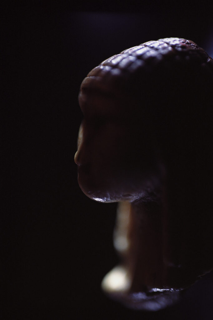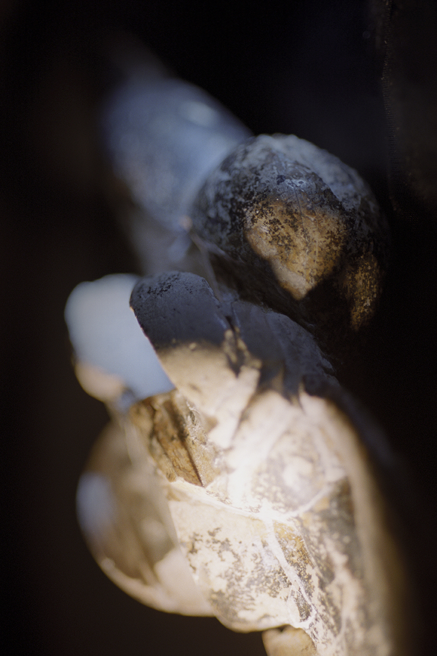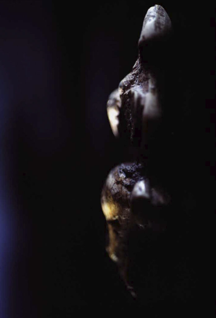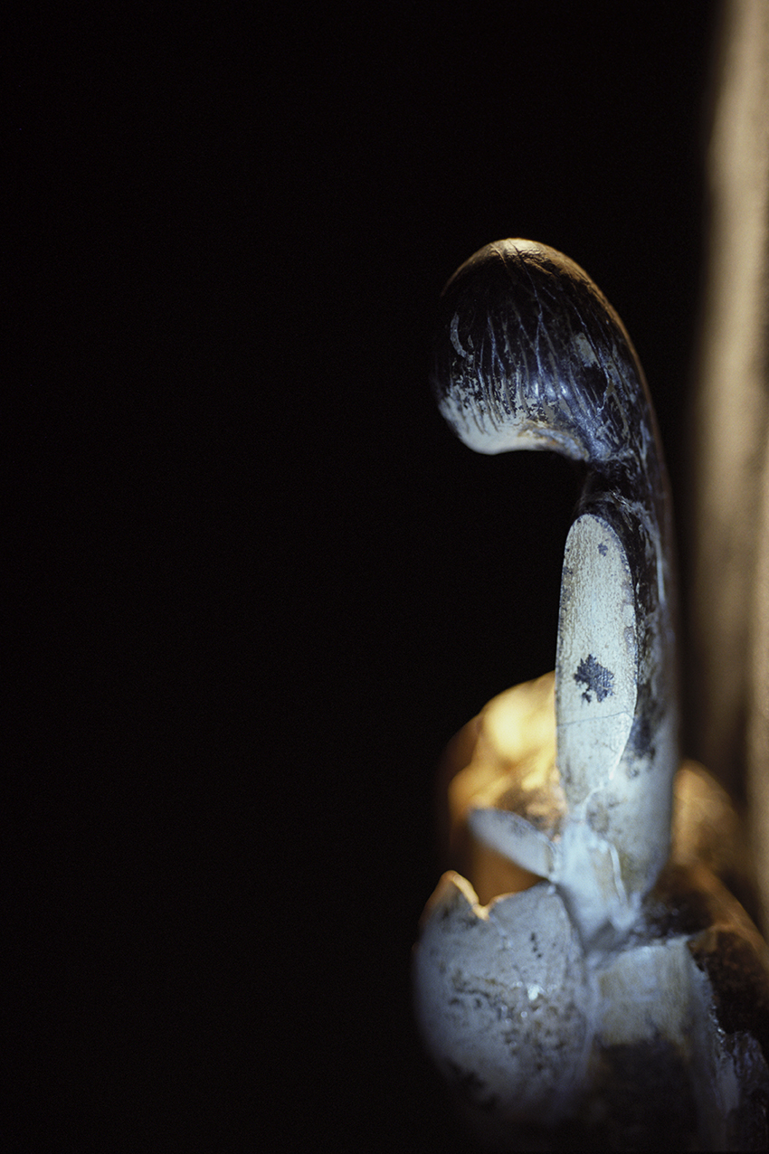 Dans sa série « Mémoires », Claire Artemyz photographie des objets* façonnés par l’être humain durant la préhistoire : outils, figurines, armes. L’approche de l’artiste n’a rien de documentaire. Sous son œil, ces artefacts inertes semblent s’animer d’une présence, nous ouvrant l’accès à un monde lointain dont il ne reste que de très rares bribes parfois encore difficiles à interpréter. Statuettes, bolas, silex ne sont alors plus des sujets d’étude, mais des seuils vers un monde qui a forgé le nôtre. Appréhendant pleinement la charge historique qu’ils portent en eux, la photographe s’emploie à les réveiller, à rendre visible cette mémoire ancestrale et surtout à traduire toute l’émotion que cela lui procure. Elle leur insuffle un supplément d’âme, façonne pour chacun une aura, forme d’hommage à cette humanité qui les a créés. Il en résulte des images étranges, énigmatiques, issues d’un traitement esthétique rigoureux. Chaque objet est isolé, plongé dans une ambiance en clair-obscur, souvent saisi d’un point de vue macroscopique ne les révélant que partiellement. À la frontière de l’abstraction, dans ce silence évocateur, proche du recueillement, l’objet photographié se charge d’intériorité, laissant toute sa place à l’interprétation du regardeur. Il oscille alors entre identification formelle et mobilisation de son imaginaire.