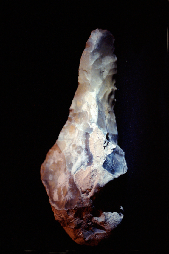 Dans sa série « Mémoires », Claire Artemyz photographie des objets* façonnés par l’être humain durant la préhistoire : outils, figurines, armes. L’approche de l’artiste n’a rien de documentaire. Sous son œil, ces artefacts inertes semblent s’animer d’une présence, nous ouvrant l’accès à un monde lointain dont il ne reste que de très rares bribes parfois encore difficiles à interpréter. Statuettes, bolas, silex ne sont alors plus des sujets d’étude, mais des seuils vers un monde qui a forgé le nôtre. Appréhendant pleinement la charge historique qu’ils portent en eux, la photographe s’emploie à les réveiller, à rendre visible cette mémoire ancestrale et surtout à traduire toute l’émotion que cela lui procure. Elle leur insuffle un supplément d’âme, façonne pour chacun une aura, forme d’hommage à cette humanité qui les a créés. Il en résulte des images étranges, énigmatiques, issues d’un traitement esthétique rigoureux. Chaque objet est isolé, plongé dans une ambiance en clair-obscur, souvent saisi d’un point de vue macroscopique ne les révélant que partiellement. À la frontière de l’abstraction, dans ce silence évocateur, proche du recueillement, l’objet photographié se charge d’intériorité, laissant toute sa place à l’interprétation du regardeur. Il oscille alors entre identification formelle et mobilisation de son imaginaire.